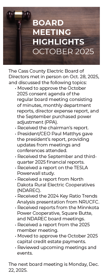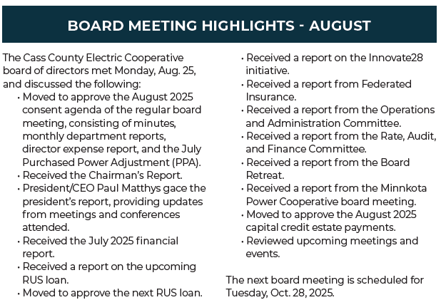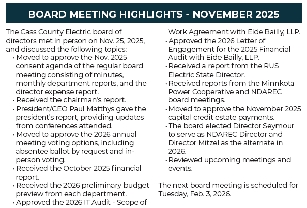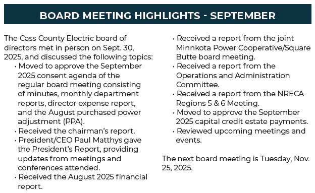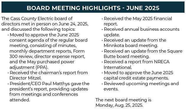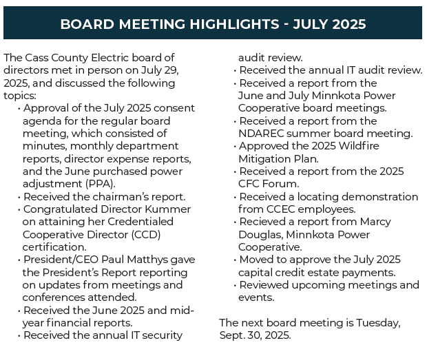 The Cass County Electric Cooperative Board of Directors typically meets on the last Tuesday of every month. For more information on board meetings, contact our executive assistant at 701-356-4405.