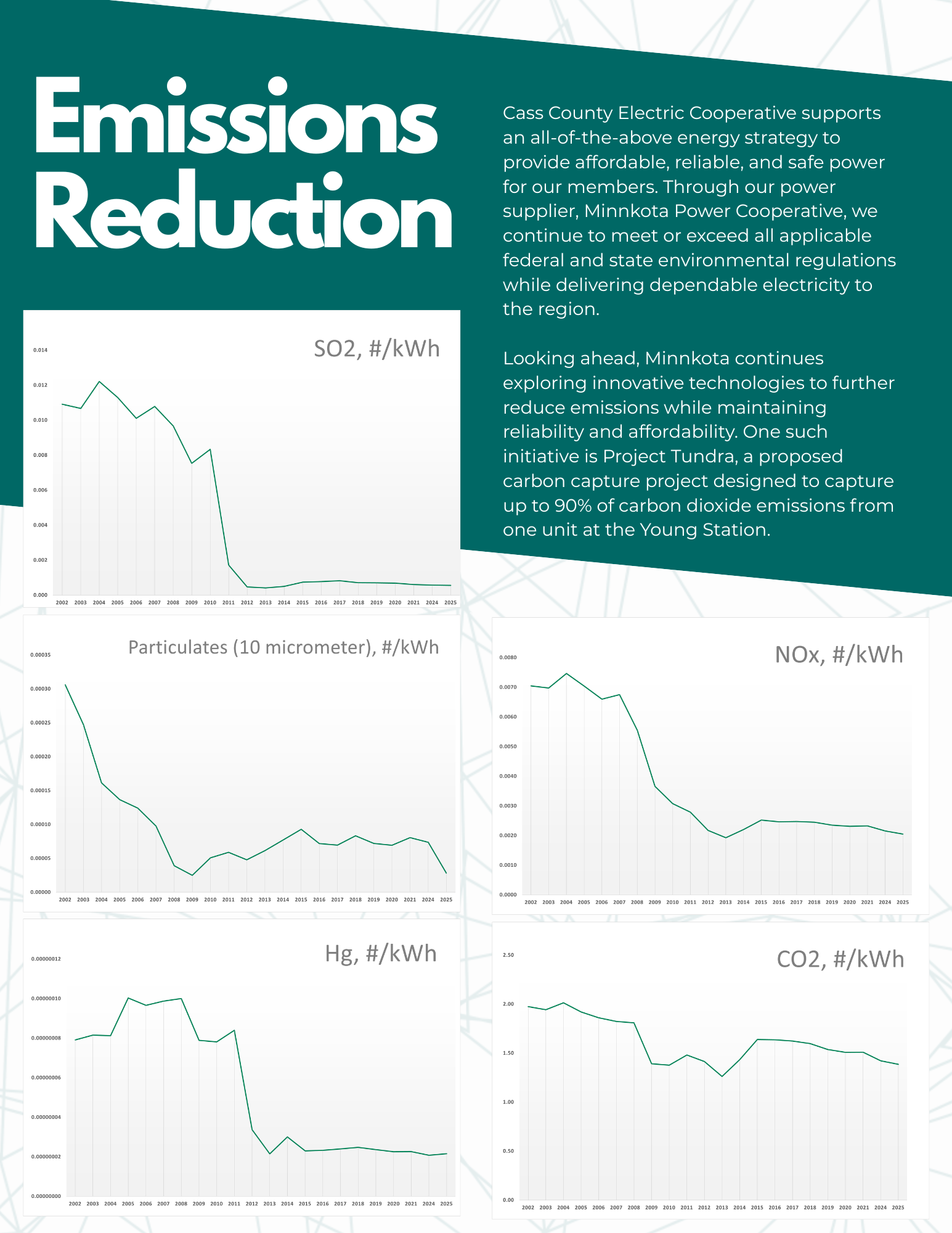 Minnkota Power Cooperative monitors and provides emission reports to the North Dakota Department of Health and the Environmental Protection Agency and continues researching, investing in, and installing emissions control technology to reduce emissions. Thanks to these investments, Minnkota currently meets or exceeds all state and federal regulations on coal emissions. The following graphs are based on reports filed by Minnkota and show Cass County Electric Cooperative's share of the emissions based on kWh sales. As the charts indicate, emissions per kWh have trended down over the last decade.