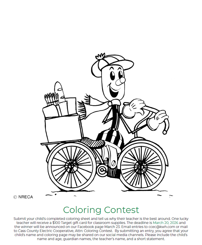 Coloring ContestSubmit your child’s completed coloring sheet and tell us why their teacher is the best around. One lucky teacher will receive a $100 Target gift card for classroom supplies. The deadline is March 20, 2026 and the winner will be announced on our Facebook page March 23. Email entries to ccec@kwh.com or mail to Cass County Electric Cooperative, Attn: Coloring Contest. By submitting an entry, you agree that your child’s name and coloring page may be shared on our social media channels. Please include the child’s name and age, guardian names, the teacher’s name, and a short statement.